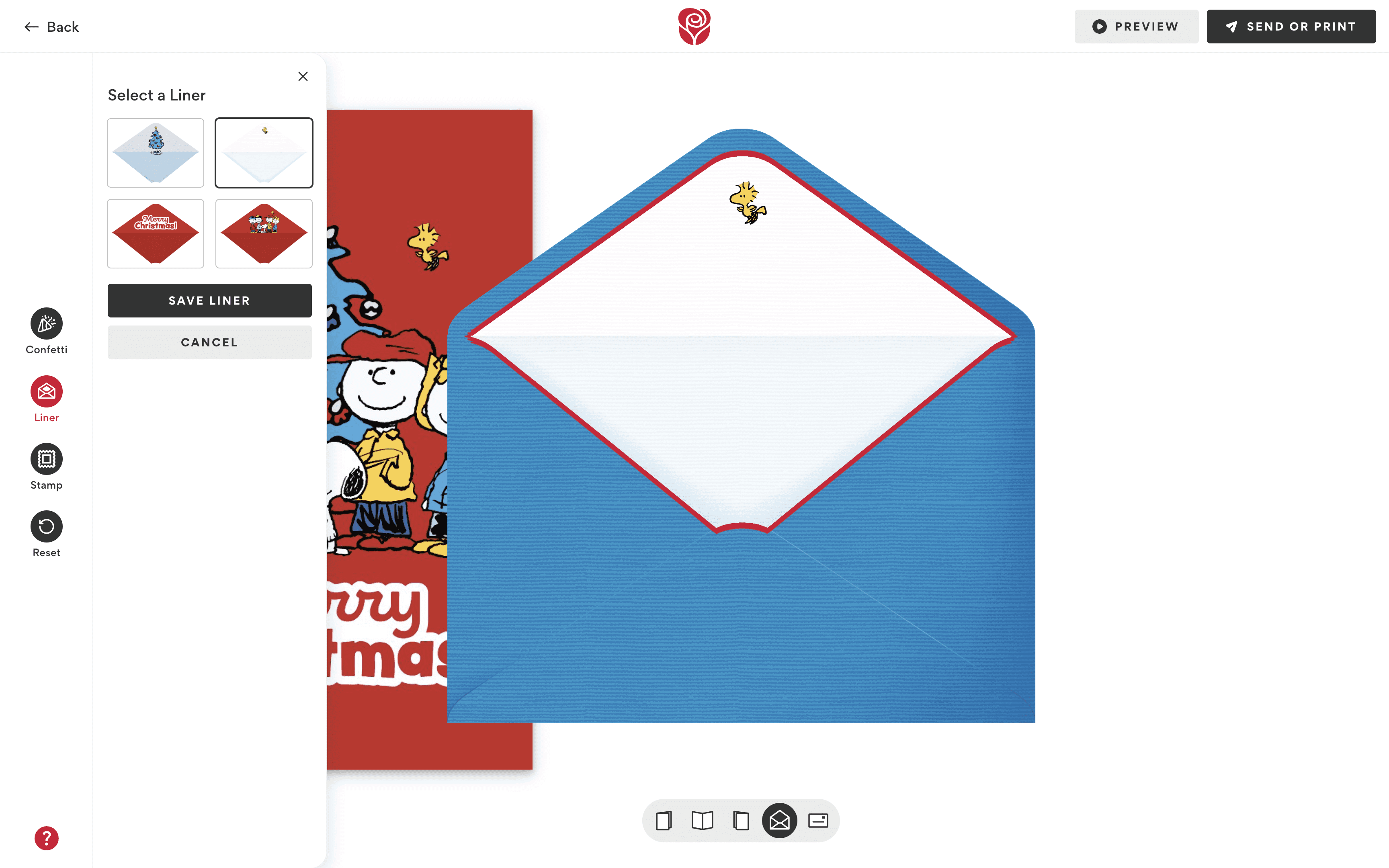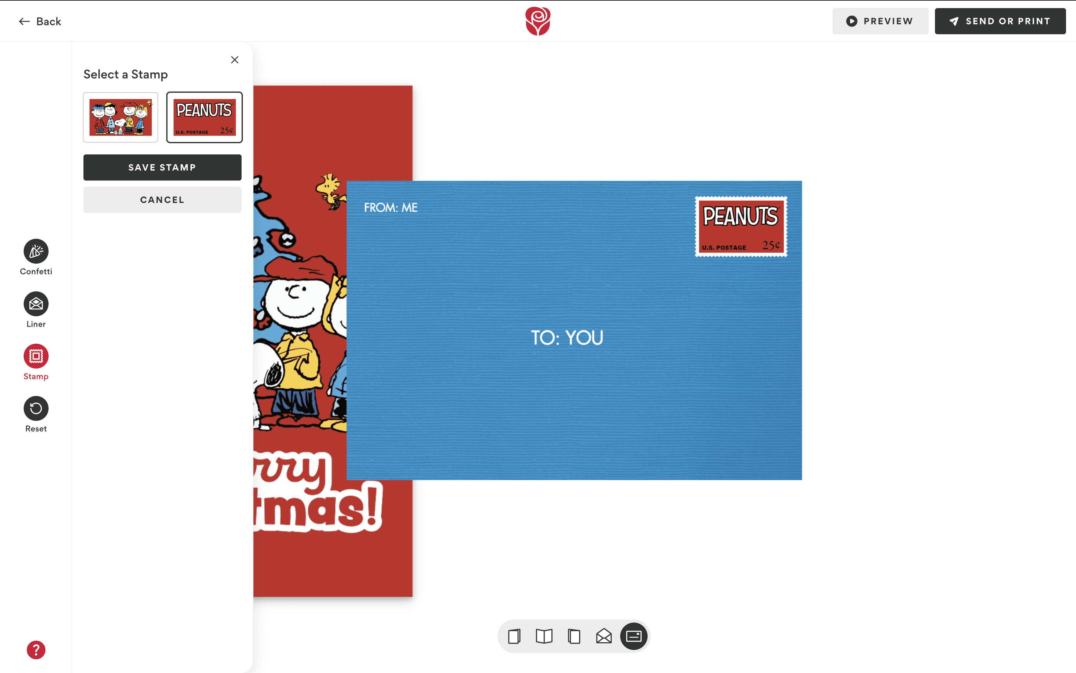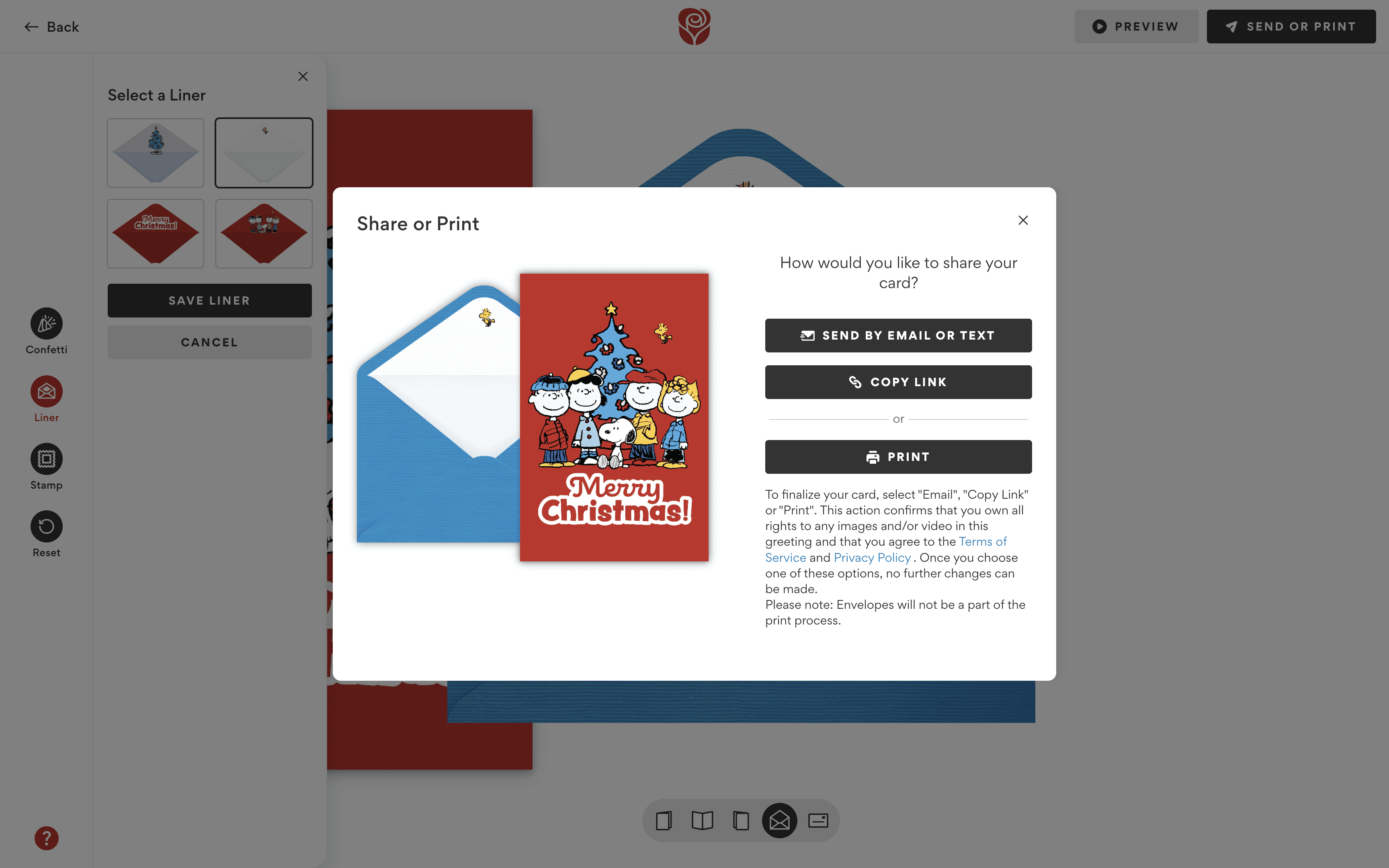 We replaced the old modal system with a universal drawer component that could be toggled open or closed at any time. The drawer dynamically updated its tools based on the area of the card being edited (ex. outside/inside of the card or envelope).